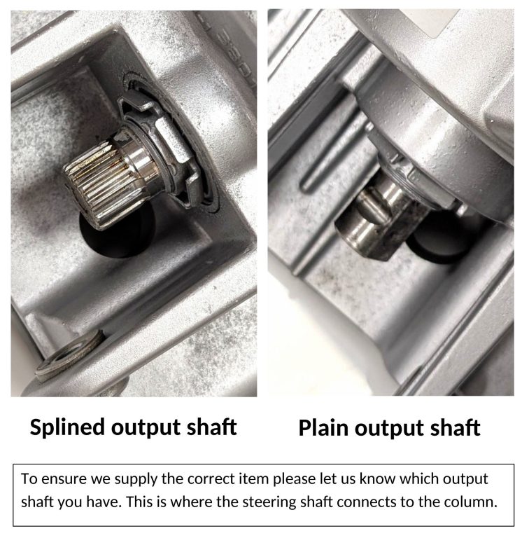 This component is only compatible with the model(s) listed above. To ensure we supply the correct item please let us know which output shaft you have. This is where the steering shaft connects to the column. If you look at the photographs we have supplied this will help. If you’re unsure, just get in touch — we’re happy to confirm it for you.